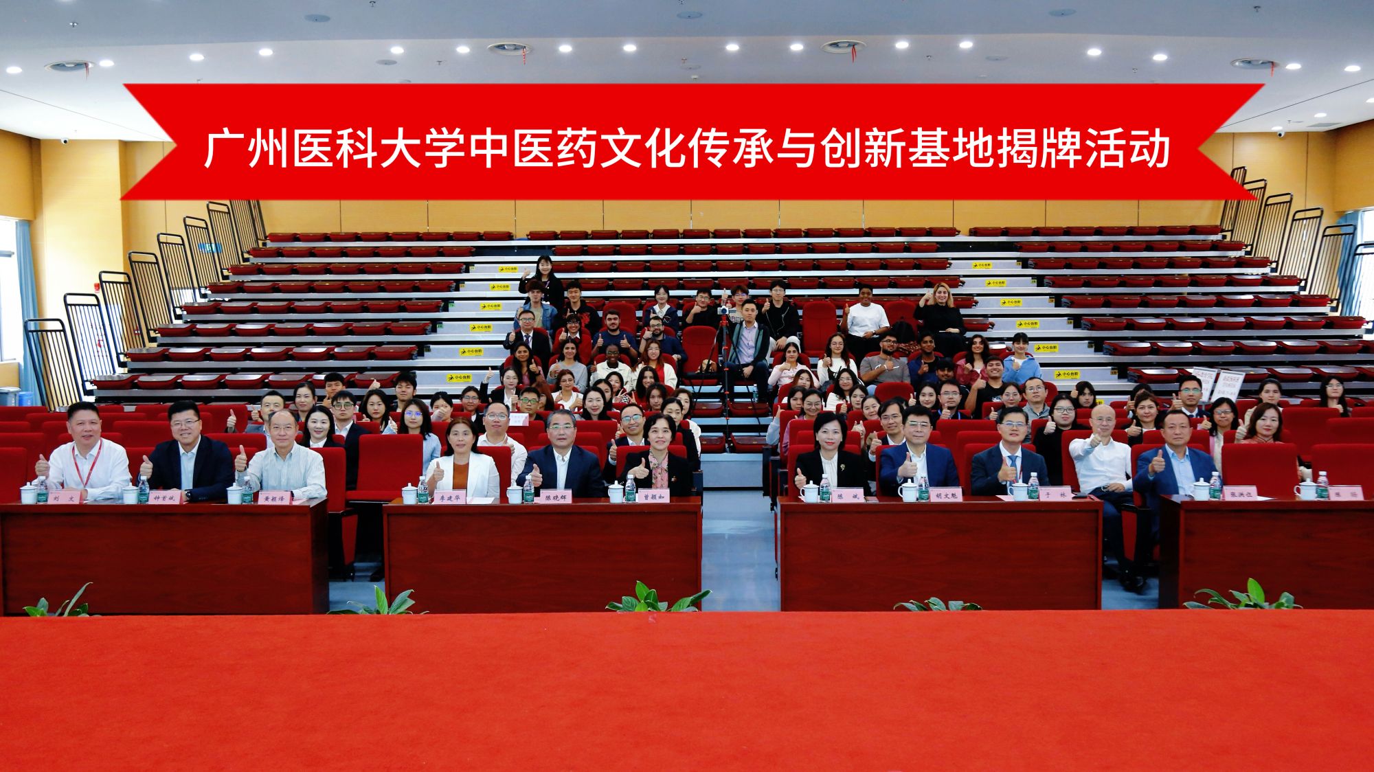 广州市卫生健康委员会党组书记、主任陈斌,党组成员、二级巡视员胡文魁,广州医科大学党委书记曾颖如、副书记陈晓辉、副校长李建华,基地依托建设单位广州医科大学附属中医医院党委书记黄颖烽,党委副书记、院长于林,专职党委副书记刘文参加活动,活动由医院纪委书记陈旸主持。市卫健委、广医、医院相关职能部门负责人,国际教育学院、预科班师生代表也一同见证了基地揭牌。