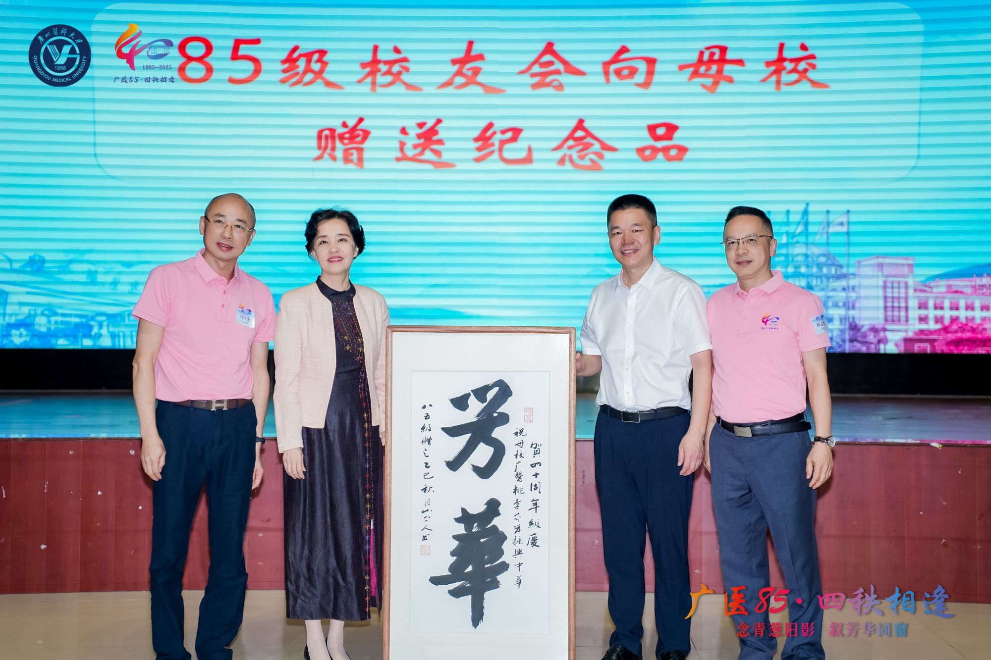 1985级校友代表邵建平、温学文、刘伟坚分享了40年来的成长感悟与人生历程。邵建平校友表示:“四十年的风霜染白了我们的双鬓,也丰富了我们的生命。广医五年的大学生涯,让我们懂得严谨、责任和对生命的敬畏。”温学文校友表示,正是母校的支持和老师们的不倦教诲,支撑着他在医疗技术和管理岗位上不断前行。海外校友代表刘伟坚通过分享10年前创立广医新西兰校友会、积极搭建校友与母校的沟通桥梁的经历,表达广医学子虽远在重洋,却心系母校的深厚情感。
