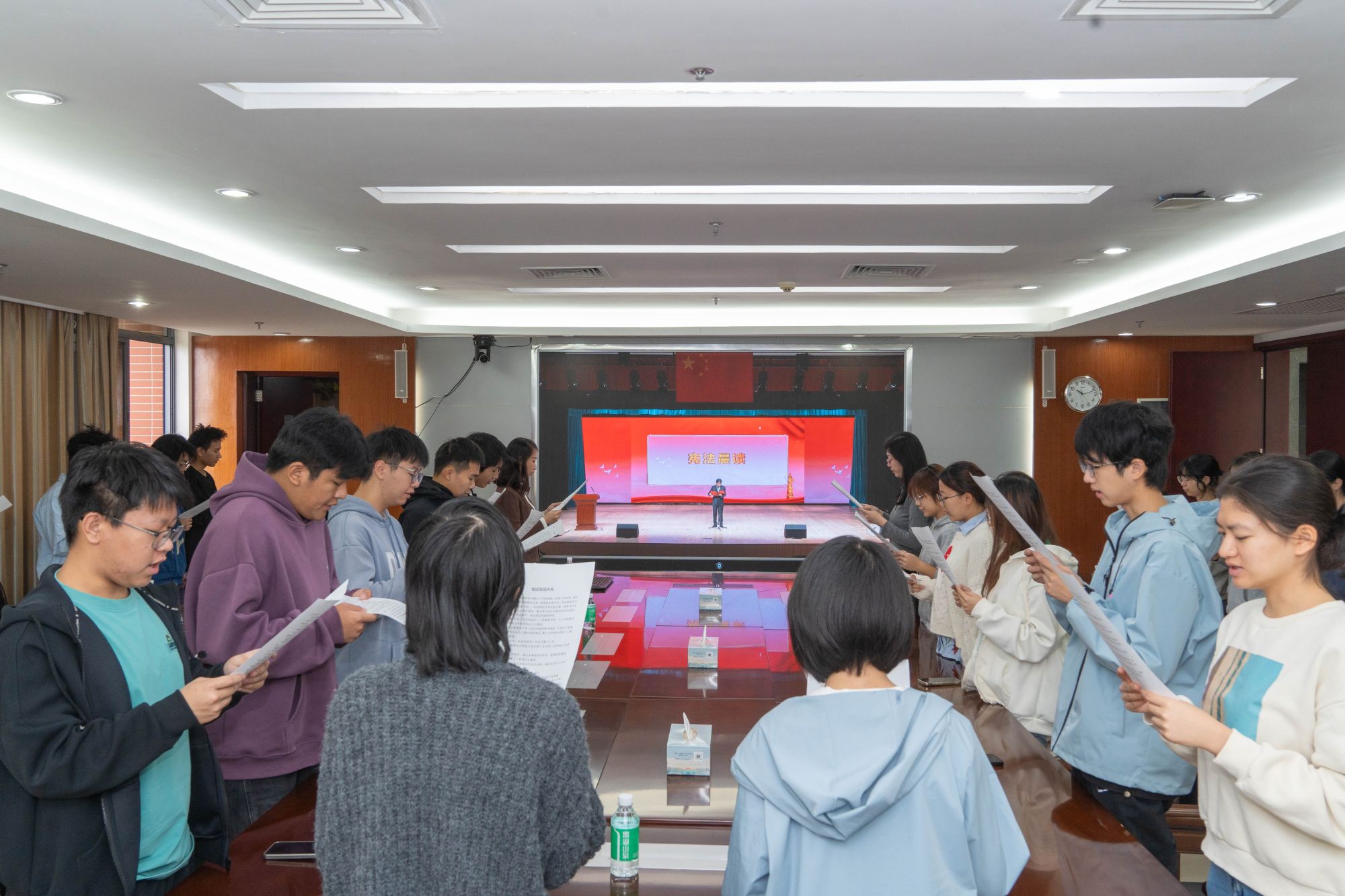 2025年12月4日是第12个“国家宪法日”。当天上午,我校组织卫生管理学院法学专业师生代表齐聚行政楼612会议室,通过网络直播全程参与了由教育部全国青少年普法网主办的“宪法晨读”活动。
