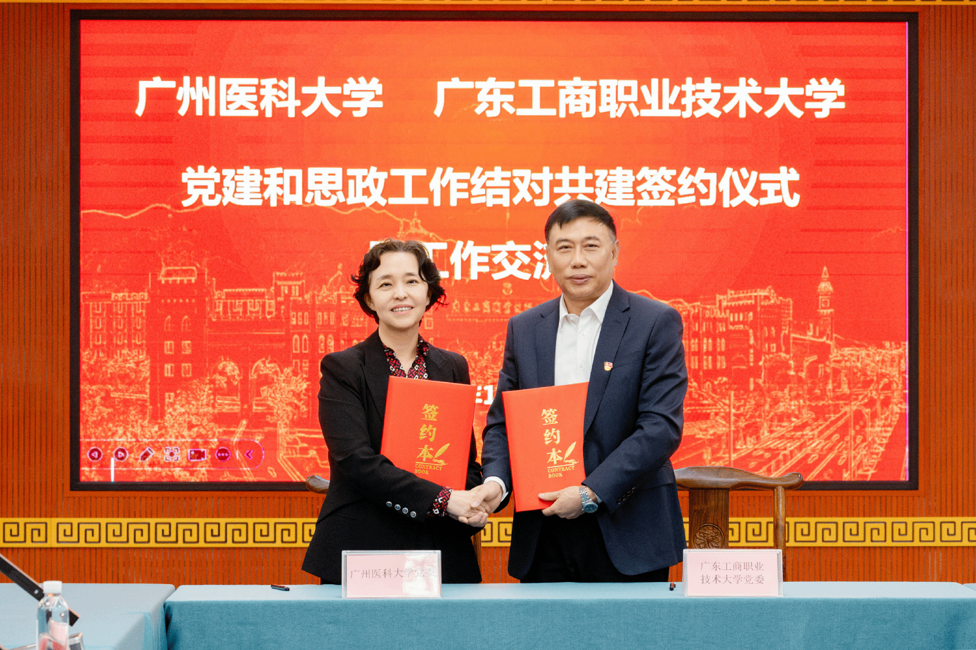 为深入贯彻习近平总书记关于加强党的建设的重要思想,全面落实全国教育大会精神和第28次全国高校党的建设工作会议精神,根据省委教育工委有关部署要求,中共广州医科大学委员会和中共广东工商职业技术大学委员会开展党建和思政工作结对共建,构建资源共享、优势互补、协同发展的长效合作机制,实现双方组织建设互促、思政教育互融、队伍能力互提、发展质量共赢。