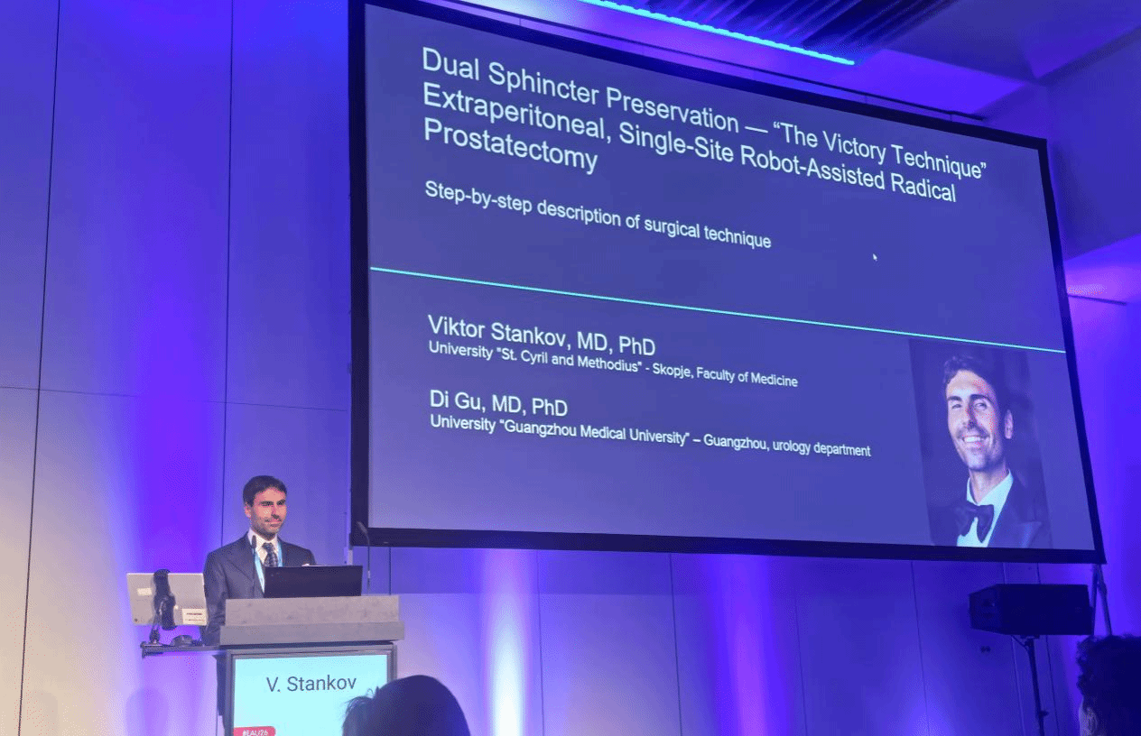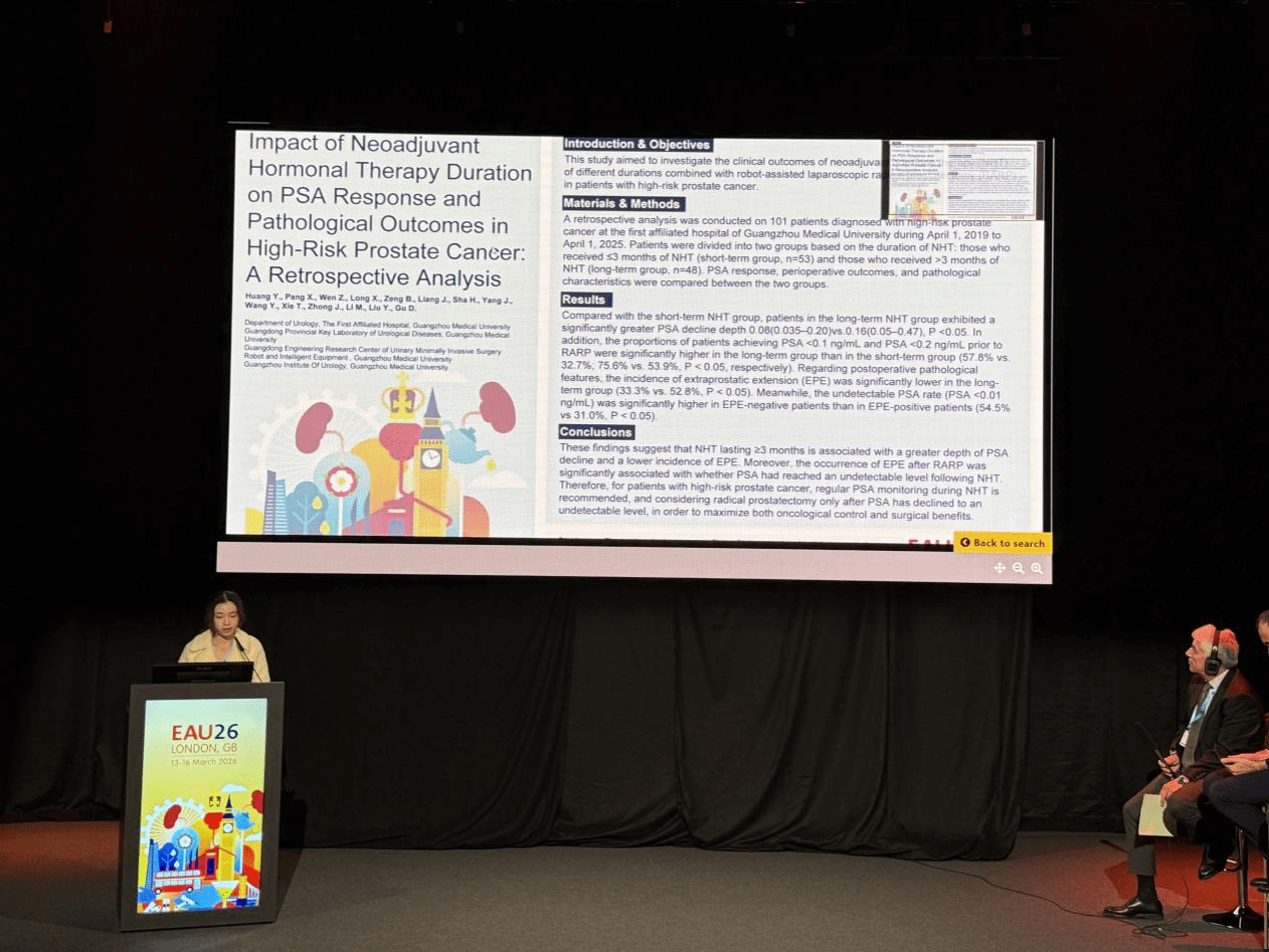 大会期间,曾国华团队共开展5项口头报告和进行9项壁报展示。其中,古迪教授介绍了中国社区PSA筛查与前列腺癌死亡率真实世界研究,Viktor Stankov医生展示了“Victory Technique”腹膜外单孔机器人辅助根治性前列腺切除术,显著提升术后早期尿控率。博士后常正林聚焦尿源性脓毒症早期诊断,硕士生黄悦婷、龙学智分别汇报了前列腺癌新辅助治疗及UTUC-zPDX模型研究,本科生张淇则探讨了膀胱癌免疫微环境机制。